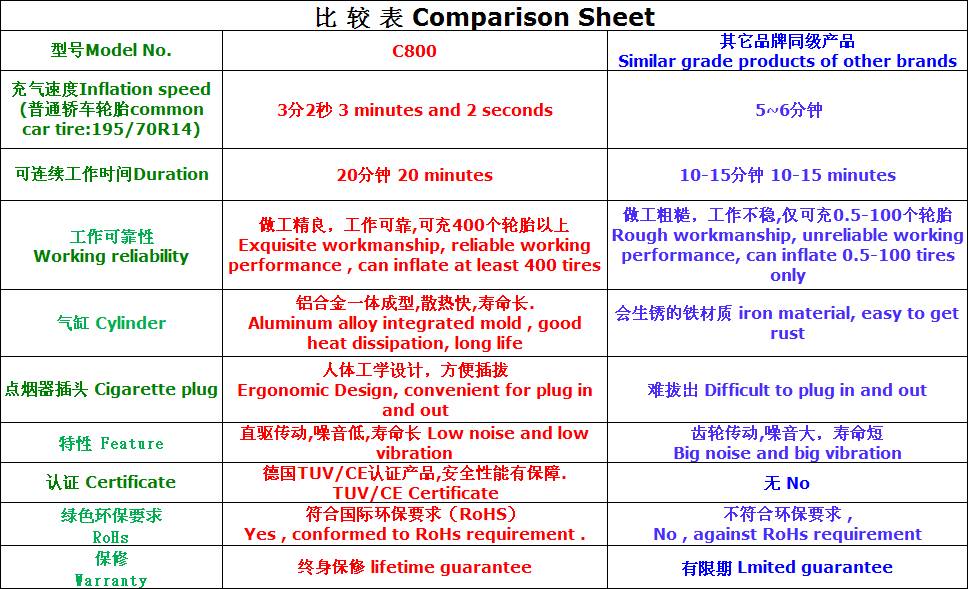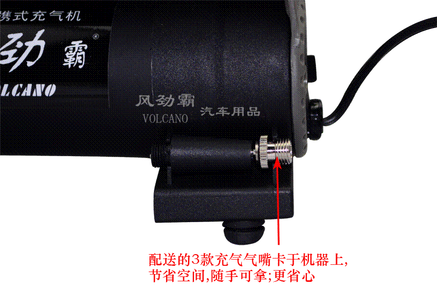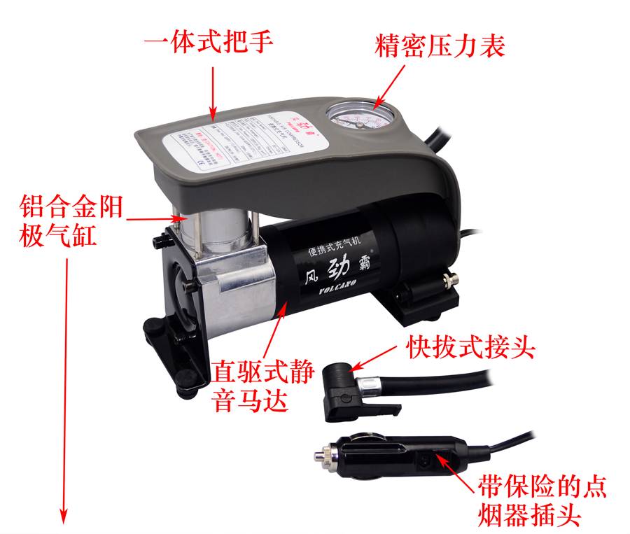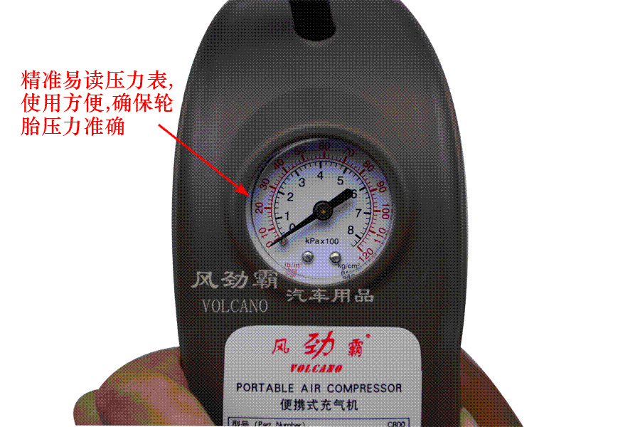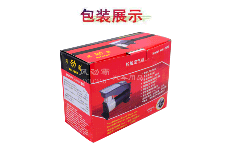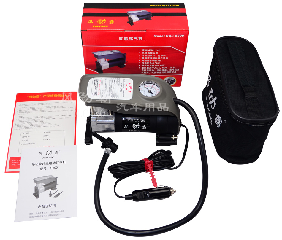 产品名称:汽车轮胎充气泵 产品品牌:风劲霸(VOLCANO) 产品型号:C800 产品产地:中国 包装重量:1.37KG 外形尺寸:182mm*75mm*140mm 工作电压:DC12V 额定功率:180W 一次工作时间:20Min. 充气速度:39L/Min. 气管长度:61cm 电源线长:310cm 七、产品展示: