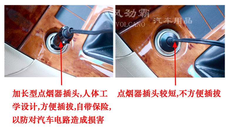 加长型点烟器插头,方便插拔;自带保险,以防对汽车电路造成损害;
