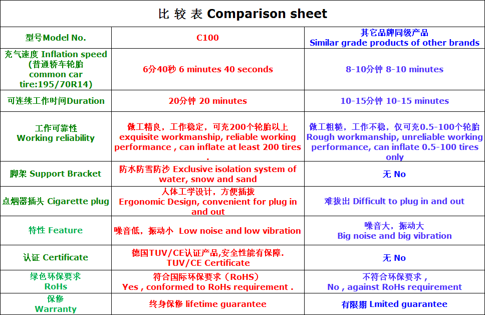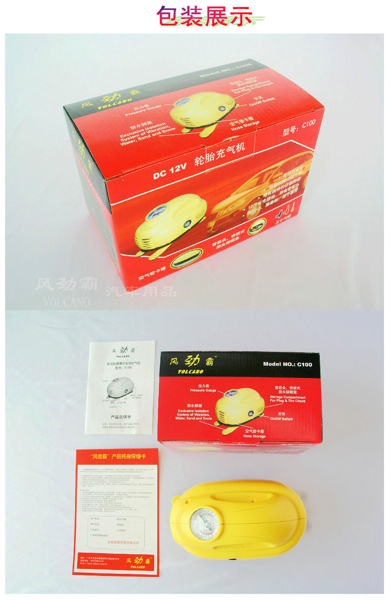 “风劲霸”C100型充气机外观独特,是“风劲霸”系列充气机中最为小巧与精美的一款!C100型充气机适用于汽车,自行车轮胎,运动球类,充气玩具,气垫床,气筏等充气。雪橇型独特外观设计,防水,防沙,防雪,便于携带,应用广泛。在任何路面,任何地点,当汽车轮胎出现突发漏气时,能运用本充气机对轮胎进行充气,发挥其救急功能。汽车轮胎随时保持正确胎压,可节省汽油,保护轮胎,并确保行车安全。“风劲霸”充气机是您日常行车,驾车旅行的安全好帮手。